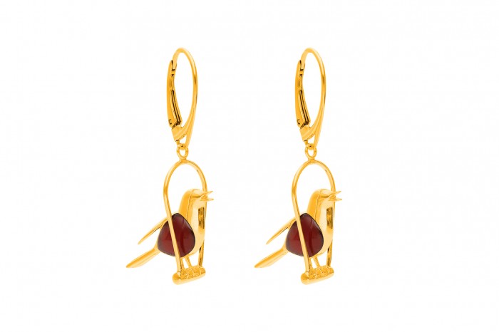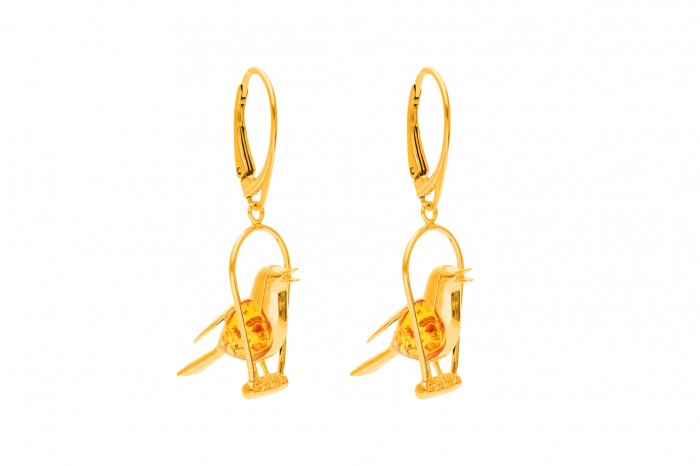 Srebrne kolczyki ptaszki z bursztynem pozłacane 18 - karatowym złotem