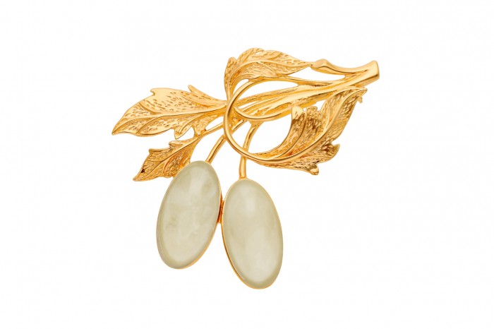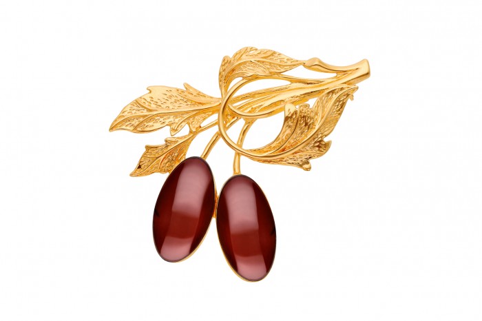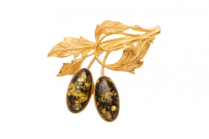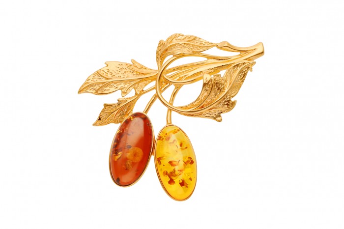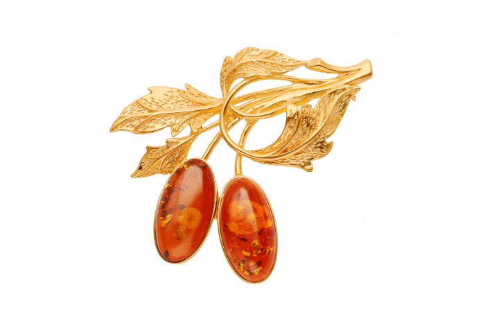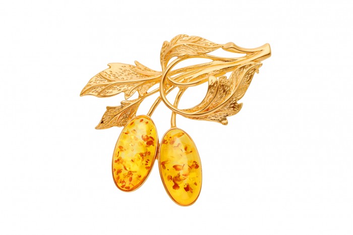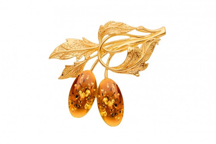 Srebrna broszka z bursztynem pozłacana 18 - karatowym złotem