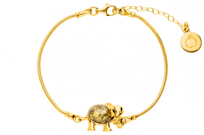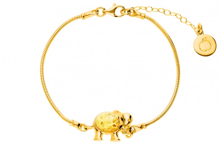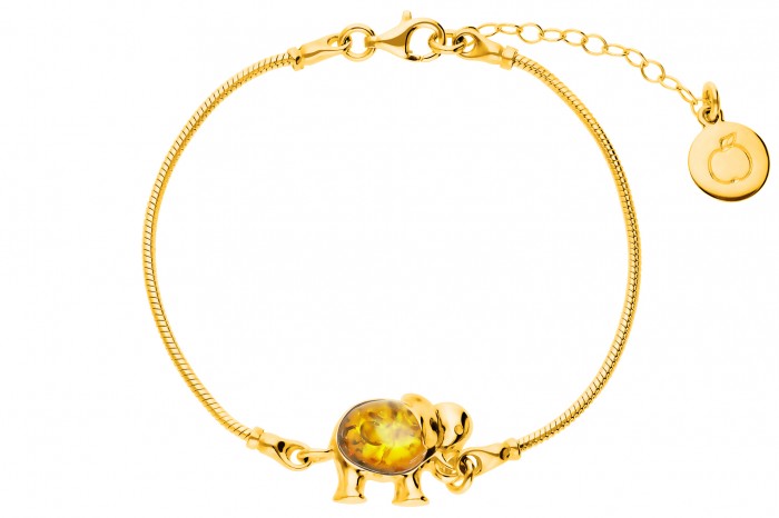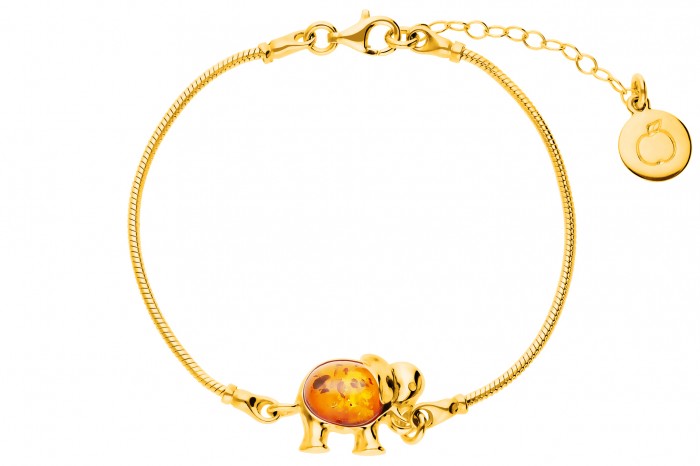 Srebrna bransoletka słonik z bursztynem o długości 17,0 cm z przedłużką 4,5 cm pozłacana 18 - karatowym złotem