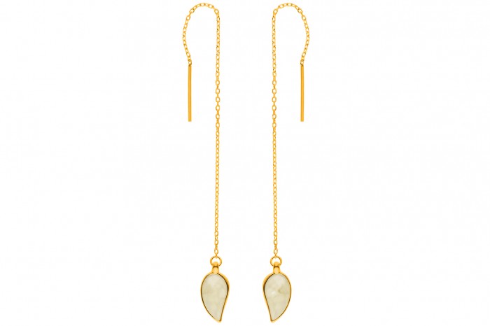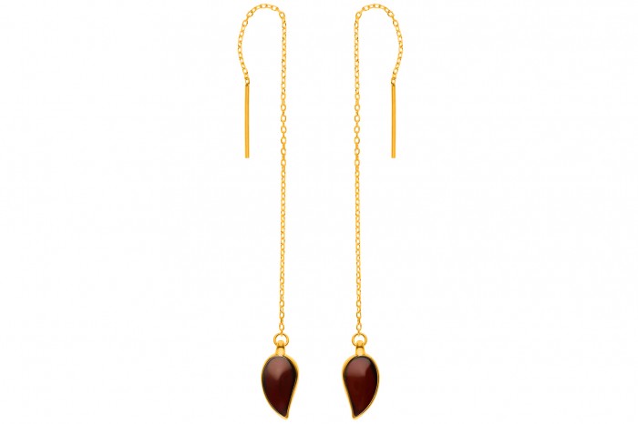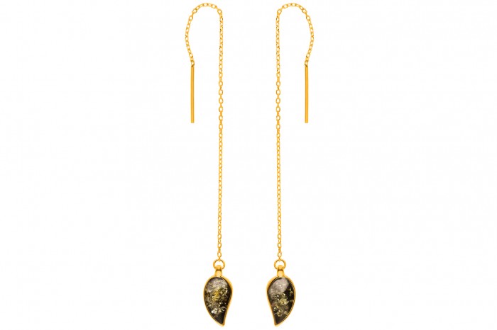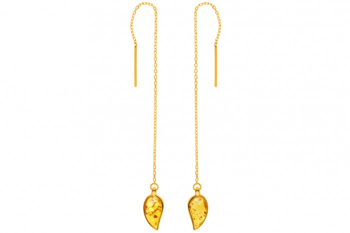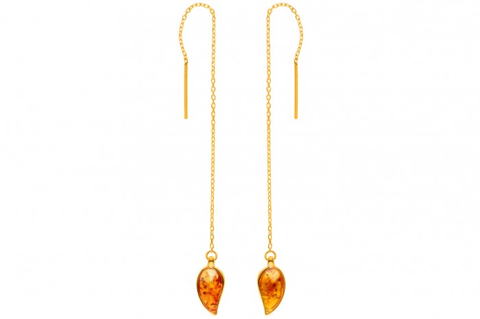 Srebrne kolczyki z bursztynem wiszące na łańcuszku o długości 12,5 cm pozłacane 18 - karatowym złotem